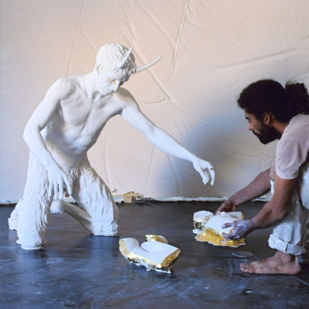 L’artiste a pris Pan, le dieu grec, créature mi homme mi bouc, comme figure centrale de son travail. Pan est à la base étymologique des mots : panique, panorama, panthéon. Il est le corps dissolu dans le paysage, il est aussi le cosmos dans le paganisme. Pan est le destructeur du lien social, il est dangereux pour la civilisation.